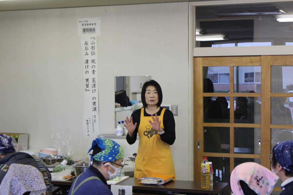 漬物講座を行いました 漬物つくり講座 公開日 2025年11月27日 「山形伝統の青菜漬けの実演・おみ漬けの実習」を11/21(金)に行いました。「さとみの漬物講座企業組合」理事長の新関さとみ先生を講師に迎え、山形伝統の漬物講話から始まり青菜漬けの実演、おみ漬けの実習を行いました。人気の講座で、二倍を超える申込の中、抽選により午前16名、午後16名が参加されました。