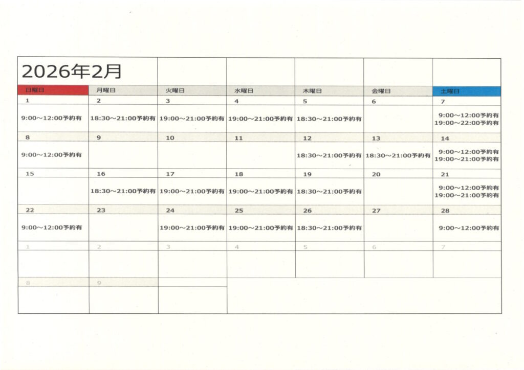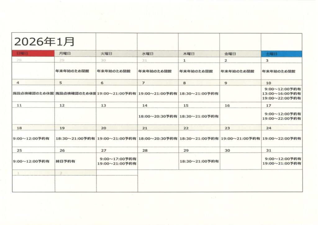 【令和8年1月13日現在】令8年1月・2月講堂兼屋内運動場(体育館)の予約状況
