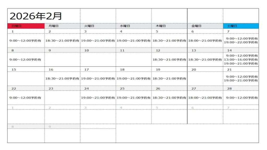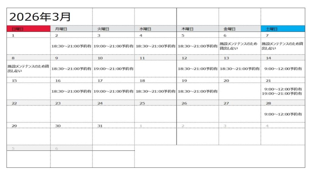 【令和8年2月2日現在】令8年2月・3月講堂兼屋内運動場(体育館)の予約状況