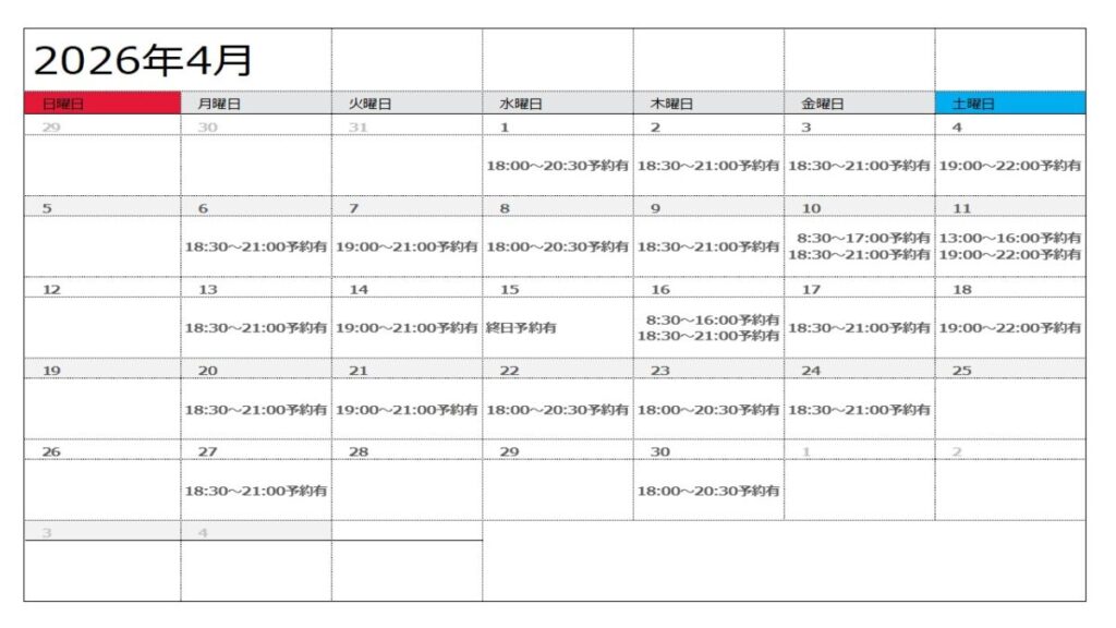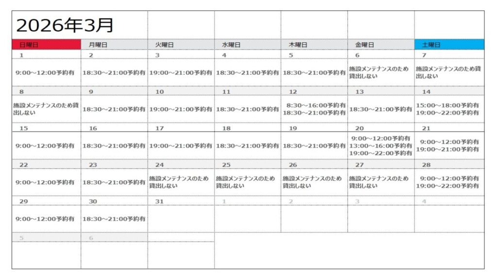 【令和8年3月11日現在】令8年3月・4月講堂兼屋内運動場(体育館)の予約状況